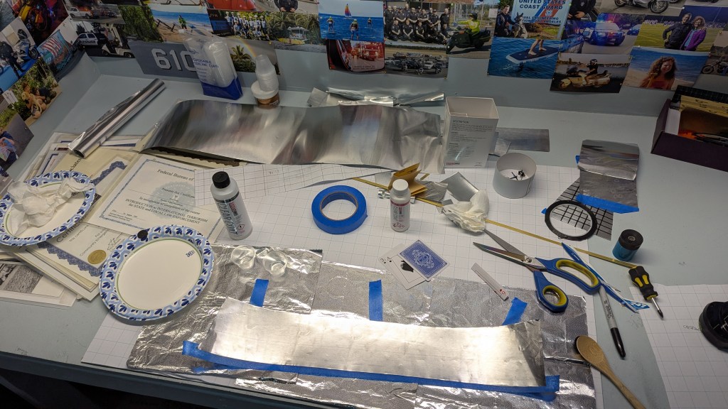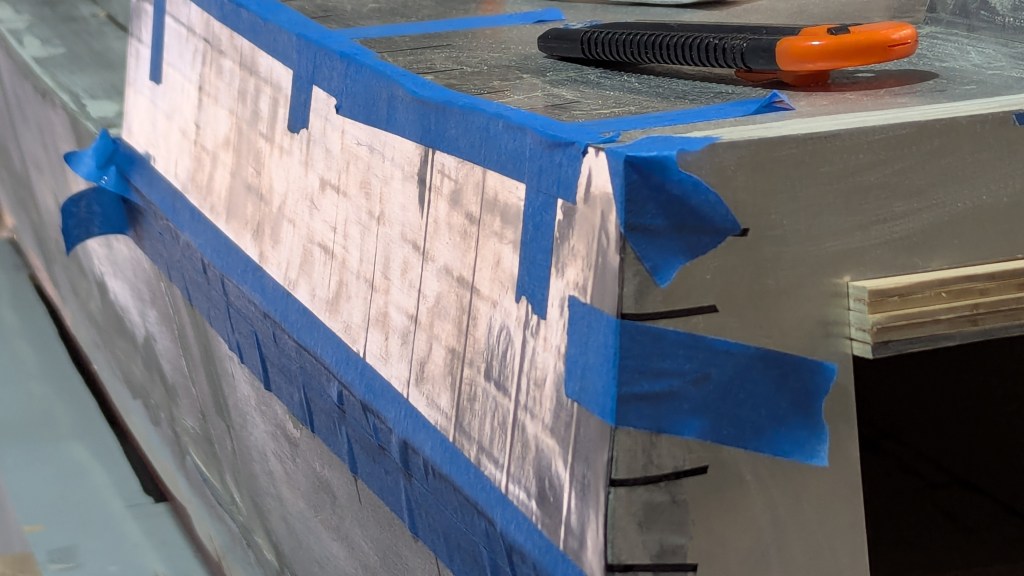 January 2026 Month Seven It's foil time. I'm now starting to glue metal onto metal. Prep includes light sanding and cleaning with rubbing alcohol on the exterior of the inner plating and of course the matching inner side of the new and final cladding. For this application, I'm using a high viscosity two-part epoxy, applied paper thin to both the hull sections and the foil. After a couple days I carefully peel off the tape and tuck in edges and corners with some extra superglue.
