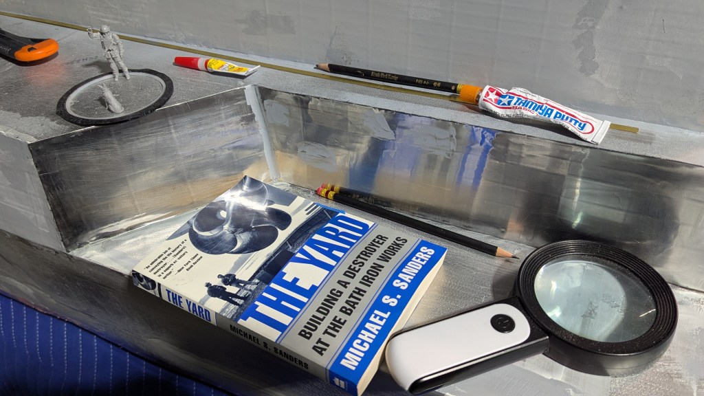 Behold! Continuing and regular in-progress updates on my first attempt at a scratch-built 1:35 scale static waterline display model of a US Navy Arleigh Burke class DDG-51 type destroyer taking over half my garage, measuring in at a barely manageable 4.5 meters long. Currently under construction in Pierce County, Washington, in the shadow of Mt. Rainier and under the occasional flight paths of the blacked-out and transponders-off JBLM 160th Night Stalkers. This fever dream of a passion project commenced in July of 2025 by Nick Hoke, retired from a 27 year long career as a first responder. Before that there had been an enlistment and overseas adventures in the 1980’s navy as a Leahy-class guided missile cruiser helmsman and also a fair amount of time was spent at Ingall’s shipbuilding when my ship was in drydock. For a refit/NTU, not because of my steering. And before all that, back in the days before flying cars jetpacks and cell phones, I was a teenage Sea Cadet which was.. uh.. ffffff.. over forty years ago. So that’s my connection to matters of naval relevance here. Now it’s March 2026, month eight of my build and this project is doing a pretty good of distracting me occasionally from the reality of this absurd timeline. And it’s therapist approved. Also cheaper.