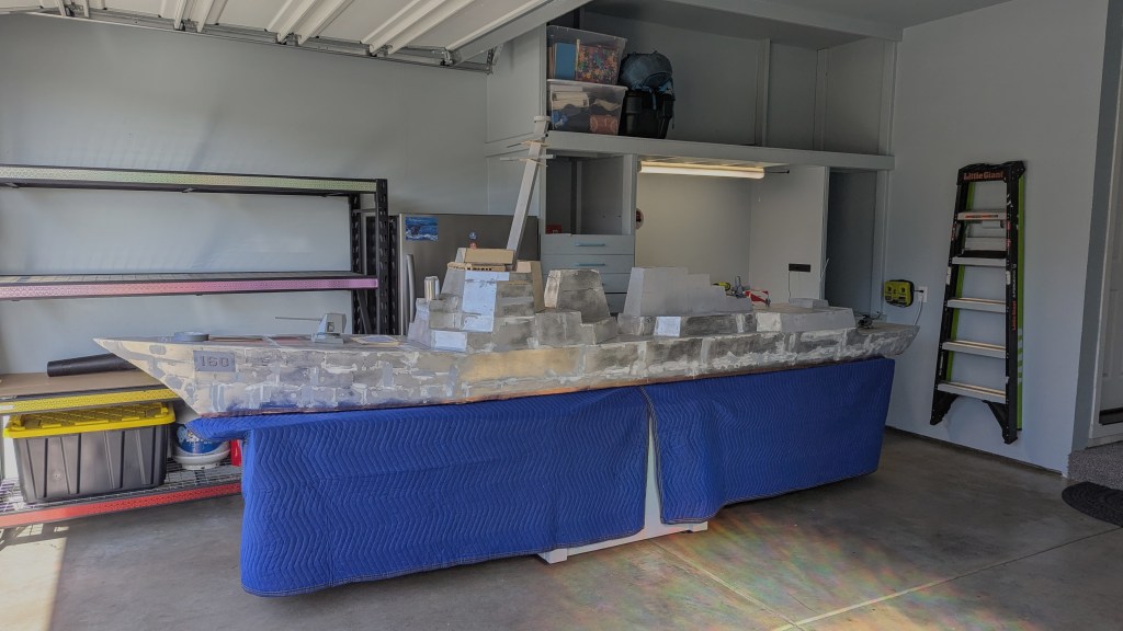 This scale model ship is almost 15 feet long. The lower hull took about a month to build, the hangers and aft deckhouse took another month, and the forward superstructure is still being worked on because reasons mostly related to geometry.